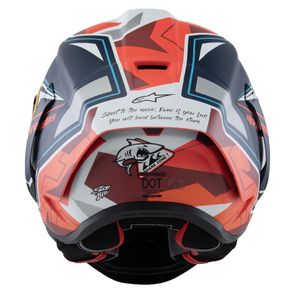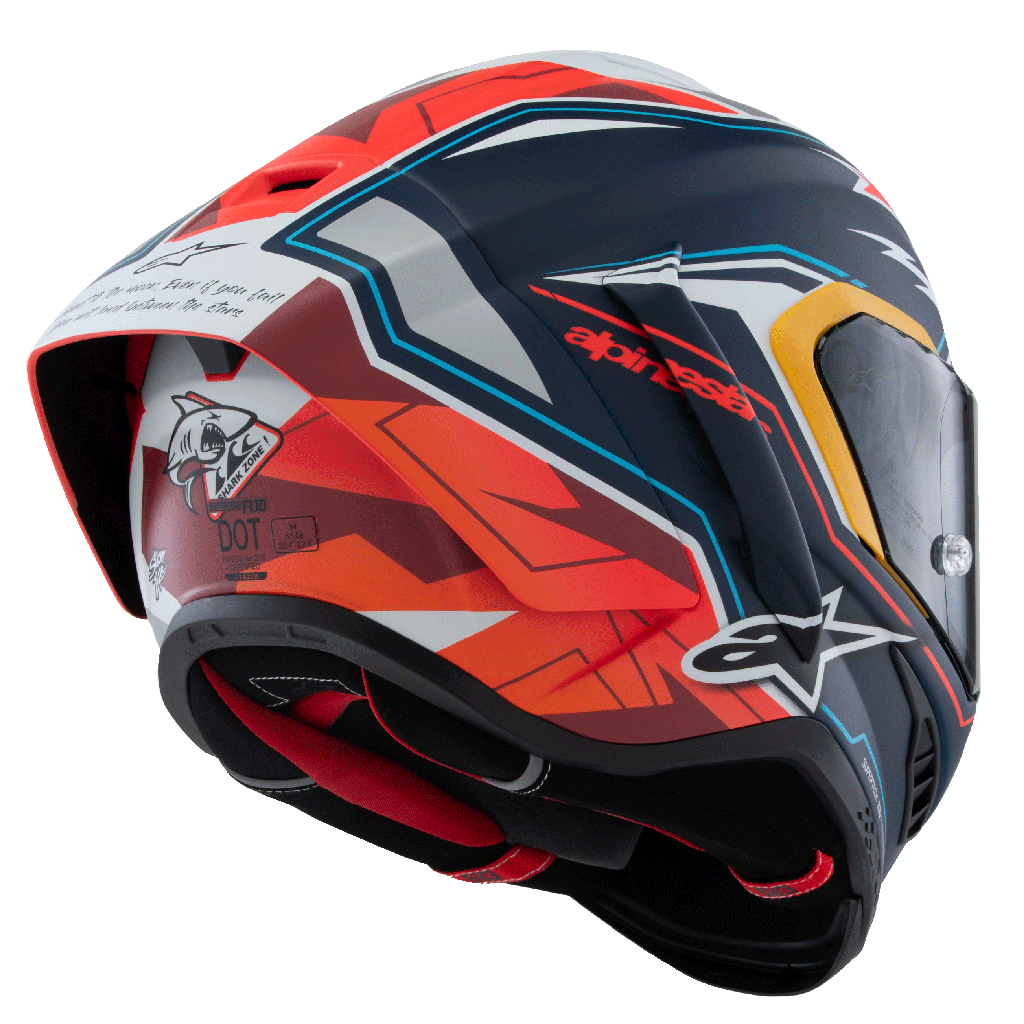 - The S-R10 comes with two separate aerodynamic spoilers – a standard, and longer race version – and they’re both fitted with an Alpinestars patented release system, with elastic joints that help the spoiler detach from the helmet shell if it is subjected to a significant impact, no matter the angle, to reduce potential rotational energy.