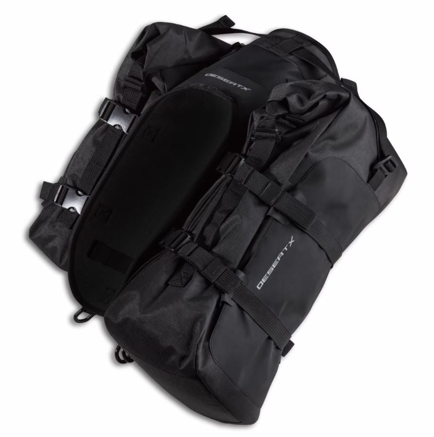 Constructed from durable hypalon material, the Ducati DesertX Soft Side Bag Set offers lightweight, waterproof storage for off-road excursions. Easily installed and featuring a modular design, these bags can be adjusted for varying capacity, making them perfect for weekend getaways. The sleek modern design seamlessly complements the bike's character, providing both practicality and style.