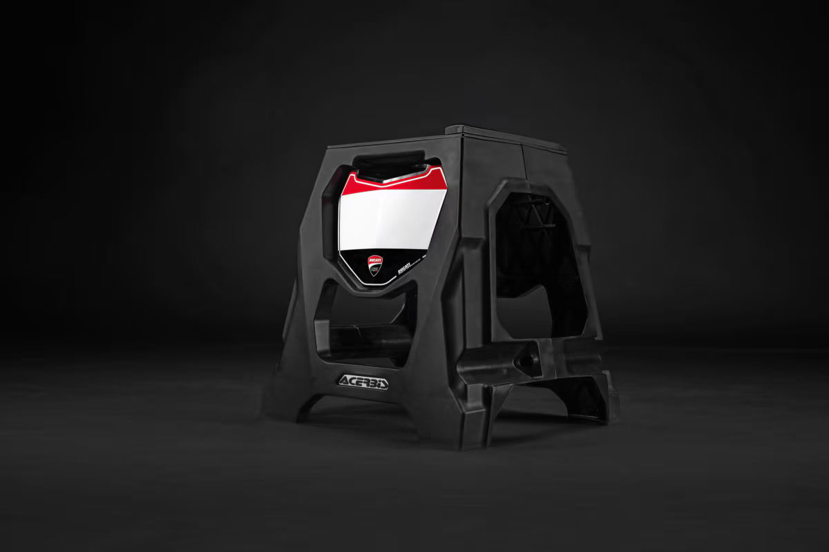 Constructed from premium lightweight plastic and featuring the Ducati logo, this stand is a vital tool designed to elevate the bike, making maintenance tasks easier and more efficient.