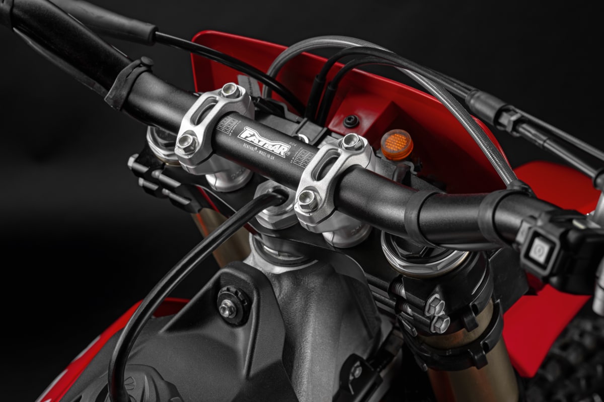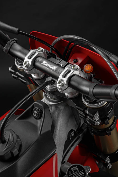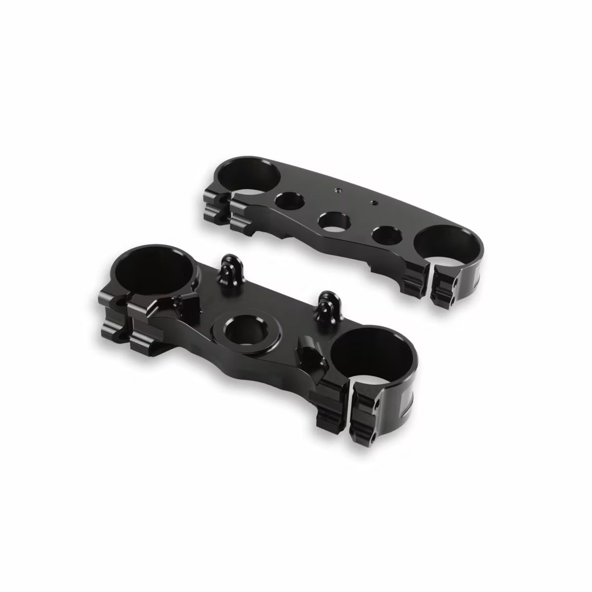 Crafted from CNC-milled and precision-machined aluminum, this triple clamp set boasts a refined anodized finish and guarantees perfect alignment of the fork stems for maximum steering pivot rigidity. Its optimized design allows for precise adaptation and secure locking onto the fork, maintaining the OEM-standard 20 mm offset. As a premium component for advanced motocross performance, it delivers highly accurate and fluid fork response, improved handling, enhanced front wheel stability, and a consistently smoother power delivery throughout the ride.
