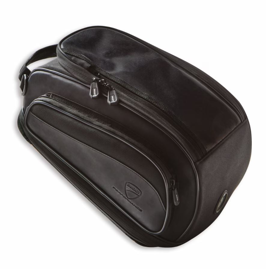 Constructed from durable UV-resistant technical fabric, the Magnetic Tank Bag for the Diavel V4 maintains its sleek appearance over time. Featuring a magnetic tank hooking system for secure attachment at high speeds, it can also easily convert into a backpack with the included shoulder straps. With an 11-litre capacity and a waterproof cover, this bag is perfect for comfortably carrying all your travel necessities.
