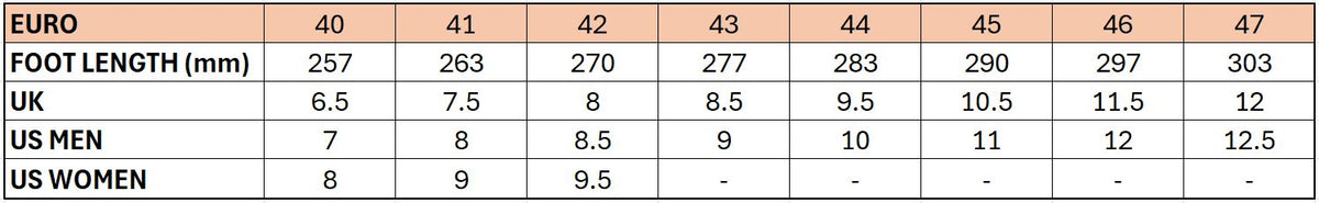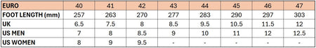 | US MEN | 7 | 8 | 8.5 | 9 | 10 | 11 | 12 | 12.5 |