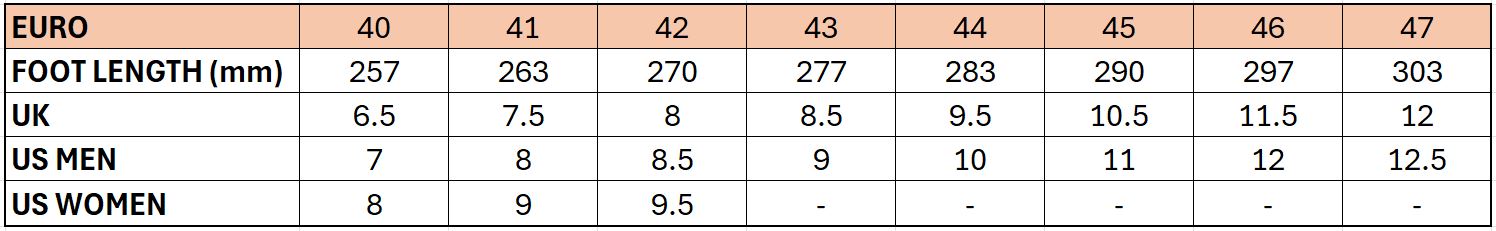 | EURO | 40 | 41 | 42 | 43 | 44 | 45 | 46 | 47 |