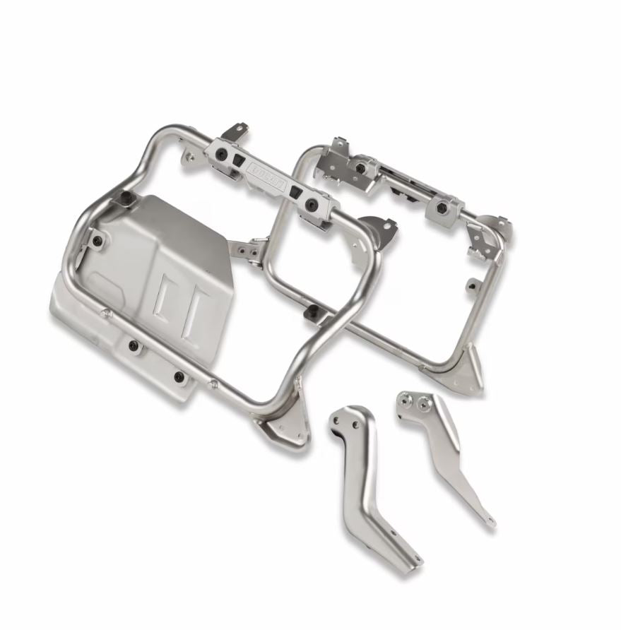 This subframe set enables the attachment of aluminum side panniers onto the Ducati Multistrada V4. The system utilizes premium materials and boasts a robust structure for optimal stability of the panniers, allowing for effortless installation. The strength and design blend seamlessly with the bike's profile, making these brackets the perfect partner for all your two-wheeled adventures.