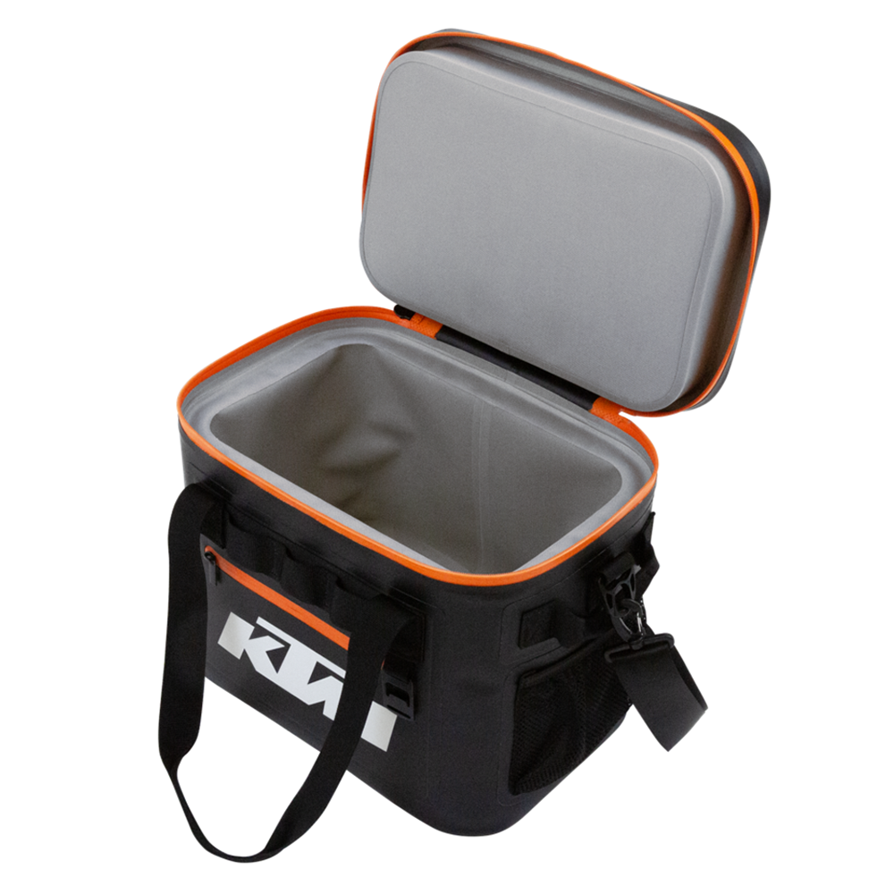 Combining practicality and sleek design, the KTM Soft Cooler maintains your beverages colder than an icy gust. It accommodates up to 20 cans and features a padded shoulder strap for comfortable transport during any outing. Equipped with advanced insulation, it ensures drinks remain chilled throughout the day. The cooler’s 100% leak-proof construction and durable zipper provide reliable spill protection. Cleaning is straightforward—simply wipe with warm, soapy water and a soft cloth, avoiding abrasive materials and harsh chemicals to preserve its quality.