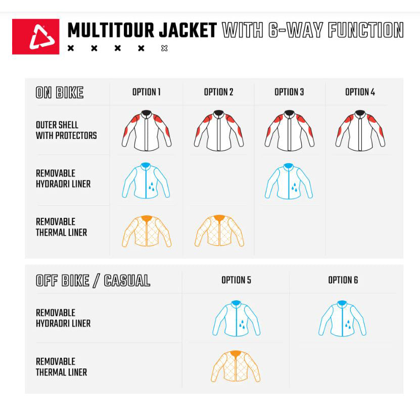 Complete with impact protection, the Leatt ADV Multitour 7.5 is a durable all-season jacket. It has six different ways in which it can be worn thanks to the light, ventilated outer layer, removable thermal liner and removable HydraDri MAX waterproof liner. Both the inner and outer layer can be used independently as light, casual jackets for either insulation or waterproof protection. This allows the jacket to adapt to any changing weather so you can continue your journey in safety and comfort