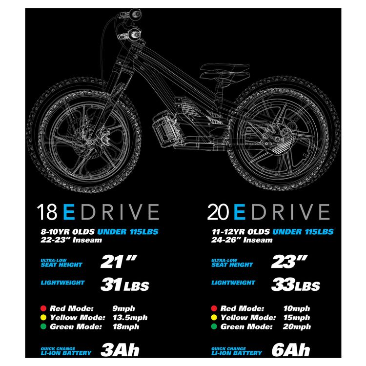 This is the top choice for the STACYC GENERATION and ready to deliver a whole new riding experience. With 3 power modes the 20eDRIVE will still allow the progression your little rippers expect from STACYC with a much larger growth curve. A top speed of 20-MPH, and dressed with MANITOU J-Unit front forks and hydraulic disc brakes the STACYC 20eDRIVE has the ability to unlock endless opportunities and develop the skills your little rippers have dreamed of. Weighing in at 33lbs with the battery the 20eDRIVE is perfect for kids between 10-12 and up to 115lbs.