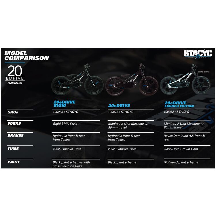 The all-new STACYC 20eDRIVE with STACYC's 36 Volt BRUSHLESS motor platform comes with the power and range to tackle aggressive riding terrain or longer trips with the crew.